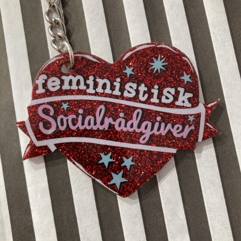 Feministisk socialrådgiver hjerte nøglering i akryl i rød glimmer. Kan også blive til julepynt.